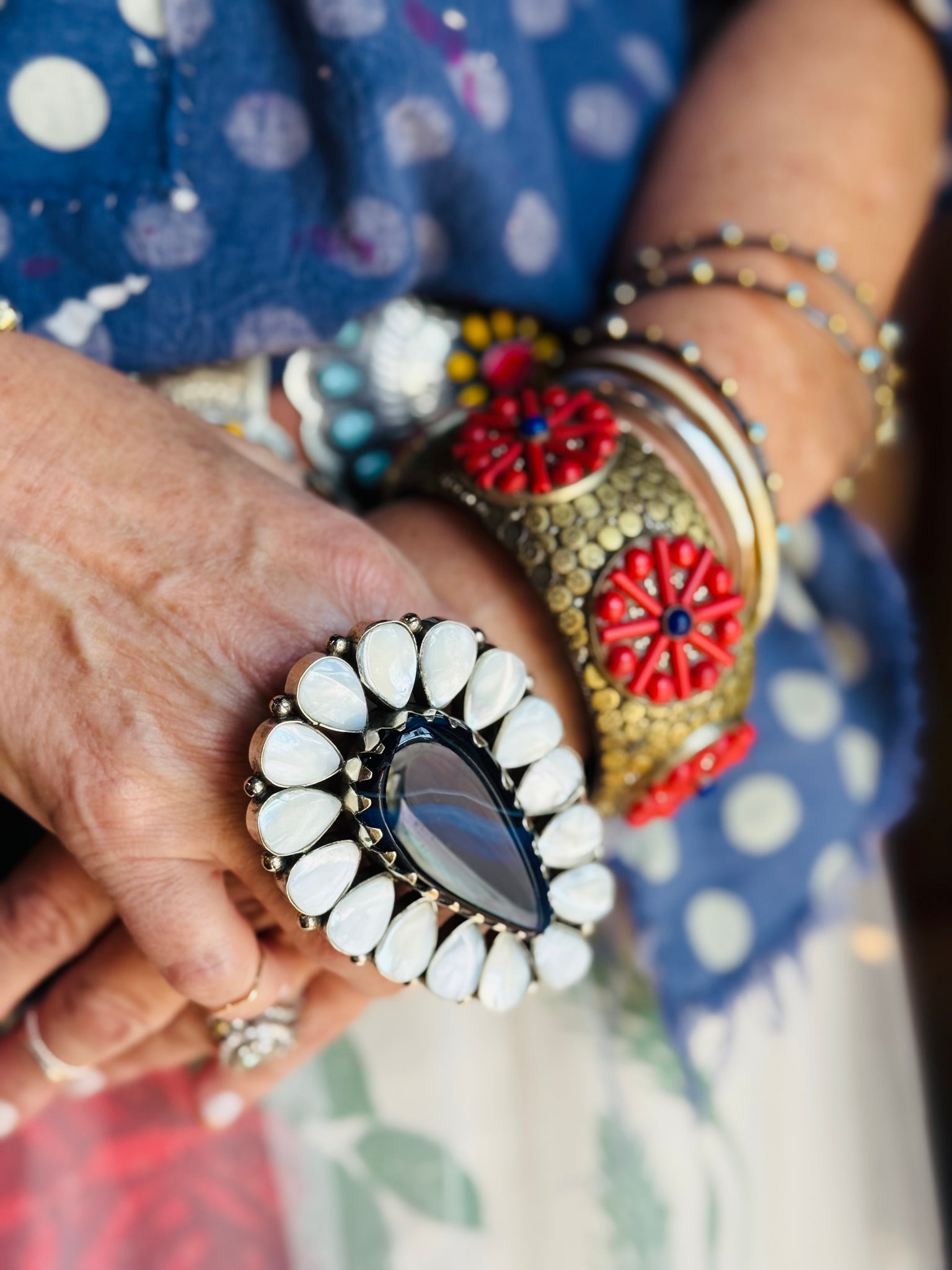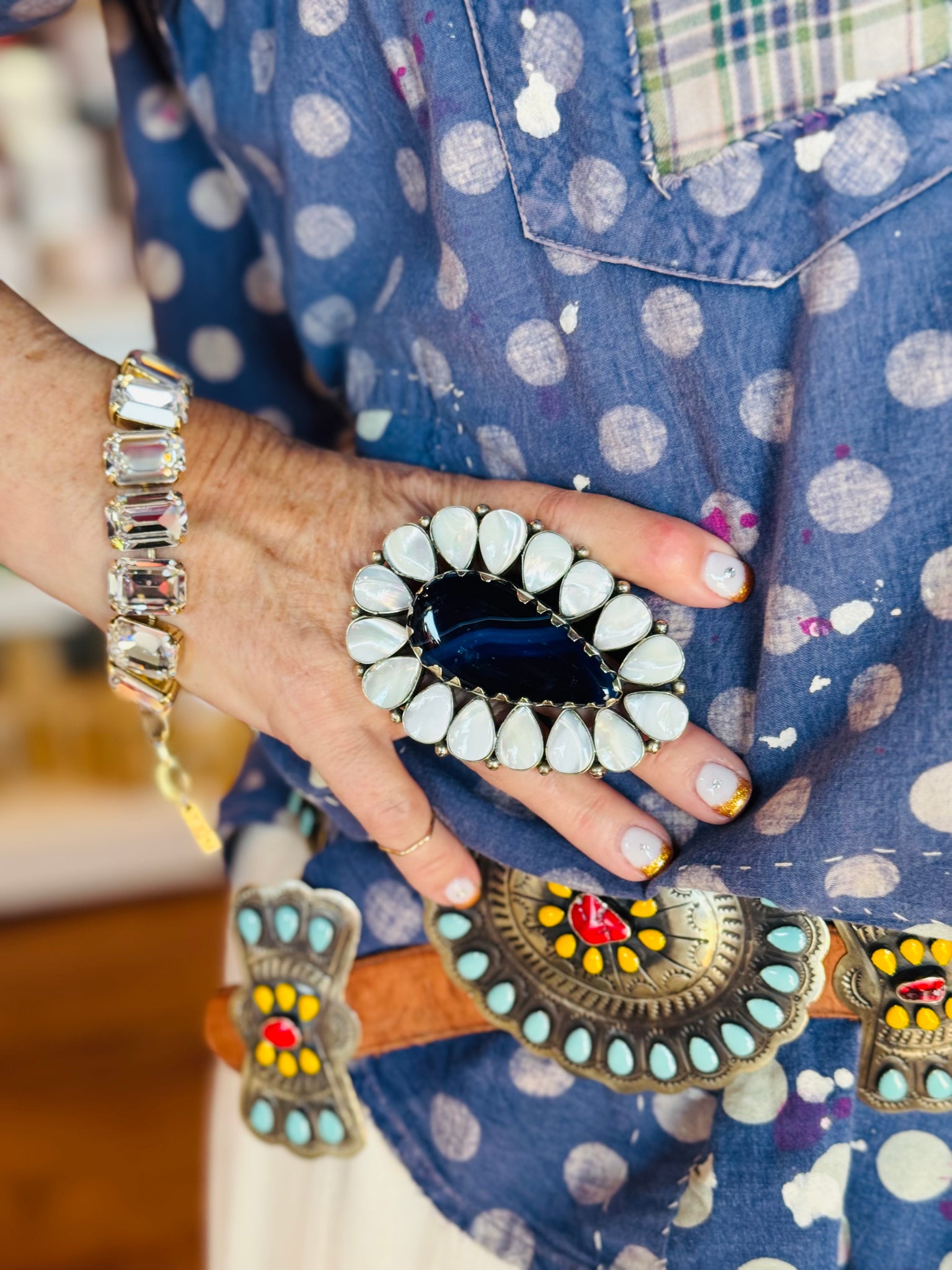 The Water Drop Ring is a charming accessory featuring an adjustable 3 x 2-inch design that fits comfortably on your finger. It showcases a captivating mix of onyx and lapis gemstones, beautifully framed by shimmering white mother of pearl. Crafted on a German western silver base, this ring combines playful elegance with durable quality, making it the perfect statement piece to add a splash of color and style to any outfit. Whether dressing up or down, this ring brings a unique, eye-catching touch to your look.